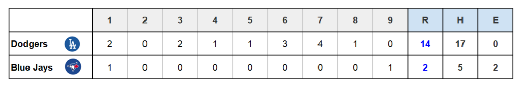 3塁ランナーは本塁へ、ブルージェイズ得点し、TOR 2-14 LAD。ランナー依然2、3塁。