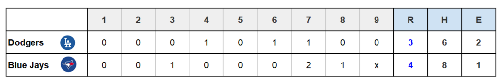 ブルージェイズが先制得点。TOR 1-0 LADに。
