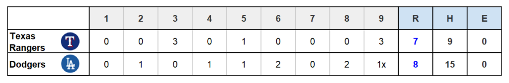 5番 M.マンシー なんと、3球目をこの日3本目のサヨナラホームランとし、ドジャース逆転し、 LAD 8-7 TEXに。
